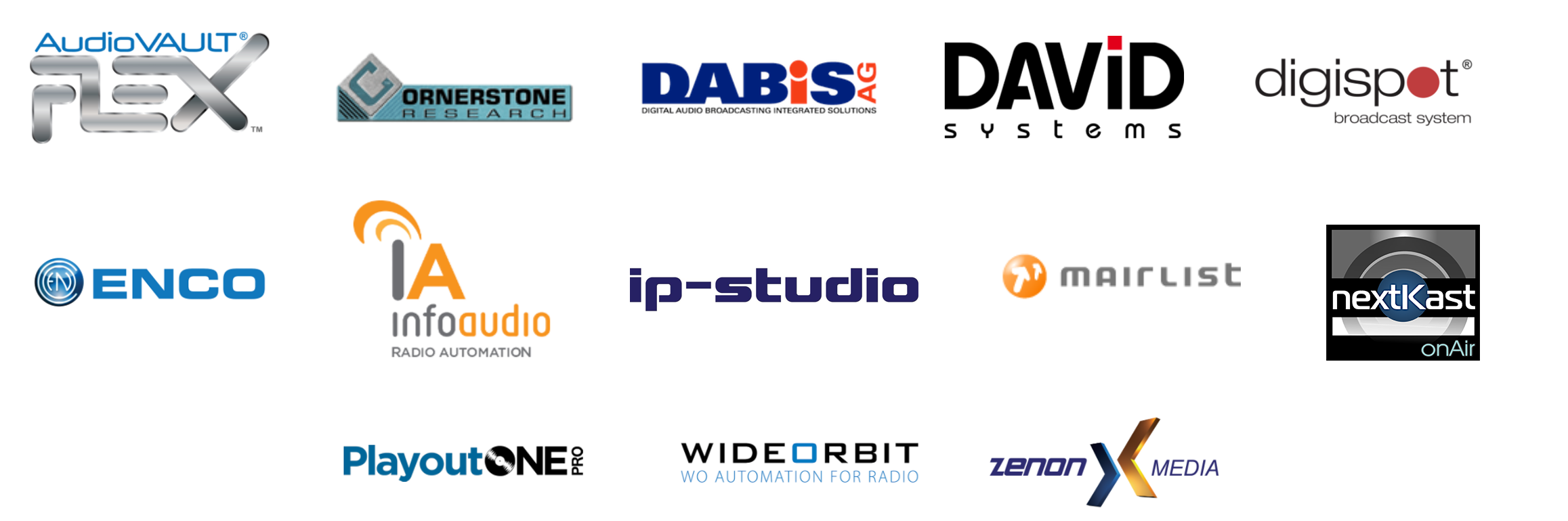 MusicMaster includes Nexus Enhanced Integration with all of the systems shown below (and the list keeps growing!). With these added features, you can seamlessly sync your music library across both systems, instantly publish music logs and updates, and stay on top of of airplay changes with real-time reconciliation. Some systems include an in-studio widget that accesses MusicMaster data, so your talent can make smarter selections when adding or replacing songs. To learn more about Nexus integration and what each of these systems can offer, Click Here